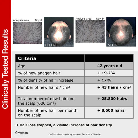 In an 84-day clinical trial on severe hair loss, Redensyl delivered visible results for 85% of users. The formula successfully increased active hair growth by 9% while reducing hair fall by 17%, resulting in up to 28,200 new hairs—the equivalent of three full hair transplant surgeries.